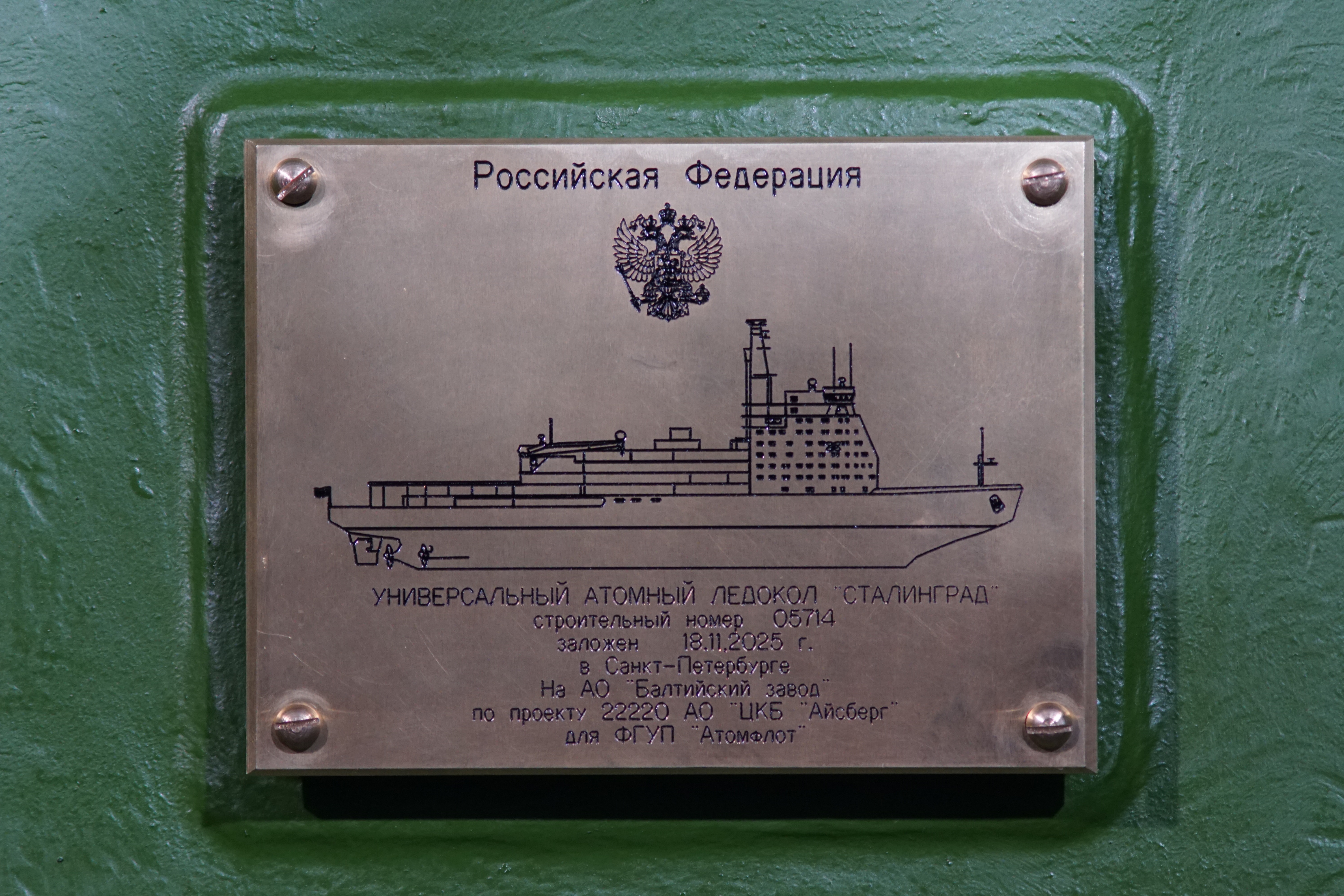 Закладную доску шестого серийного ледокола проекта 22220 «Сталинград» установили полномочный представитель Президента Российской Федерации в СЗФО Игорь Руденя, генеральный директор Государственной корпорации по атомной энергии «Росатом» Алексей Лихачев, ветеран Великой Отечественной войны, участник Сталинградской биты Павел Винокуров, участник арктической экспедиции «Росатома» «Ледокол знаний» Даниил Кононов.