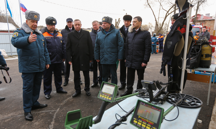 Александру Беглову и Михаилу Ведерникову продемонстрировали обмундирование водолазов, которое позволяет работать на глубине до 100 метров, саперное оборудование, использующееся для поиска взрывоопасных предметов, и другие технические средства, позволяющие выполнять поставленные перед спасателями задачи.