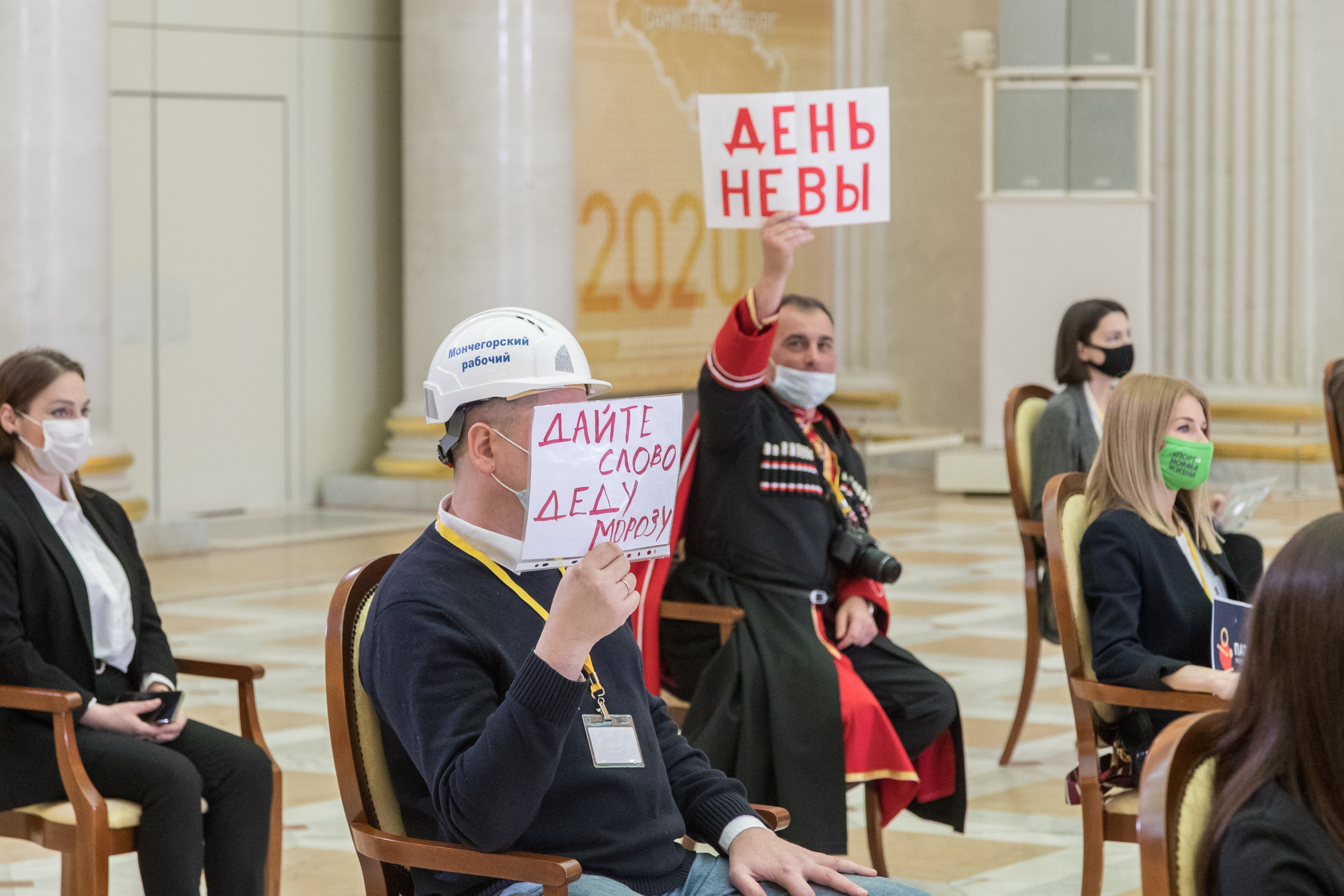 Я всех приветствую: всех, кто находится здесь, в зале, в Огарёво, в колл-центре, и в субъектах Российской Федерации, в городах, в Москве, в Петербурге.