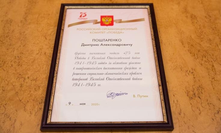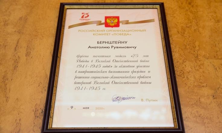Александр Гуцан по поручению Президента Российской Федерации вручил памятные медали «75 лет Победы в Великой Отечественной войне 1941 - 1945 годов» за активное участие в патриотическом воспитании граждан и решении социально-экономических проблем ветеранов Великой Отечественной войны 1941 - 1945 гг. Анатолию Бернштейну и Дмитрию Поштаренко.