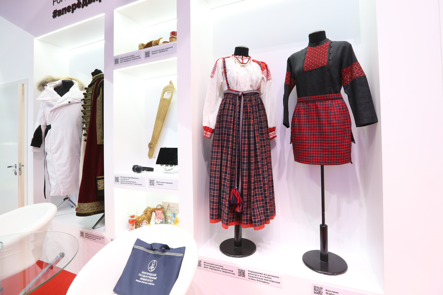 На стенде Новгородской области представлены проекты креативной экономики:текстильные изделия производства «Крестецкая строчка»; бренд одежды «Versta»; бренд сувенирной продукции «БерЁста»; бренд игрушек «Мякиши» и информация о ведущих производственных предприятиях региона.