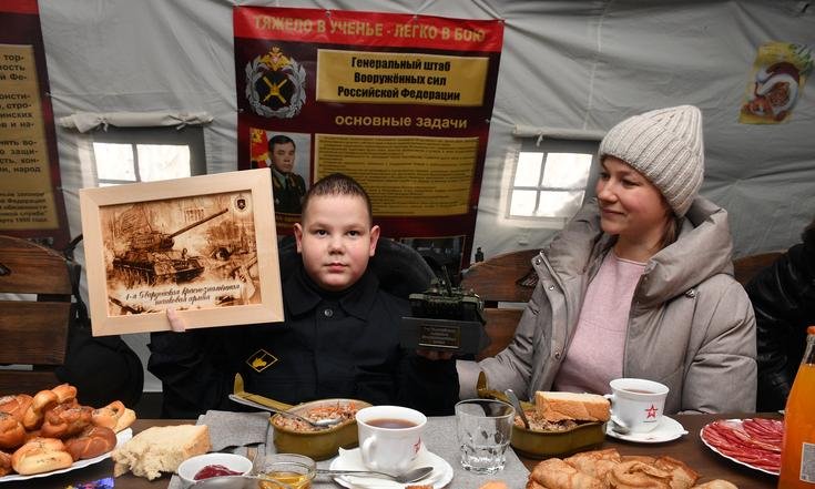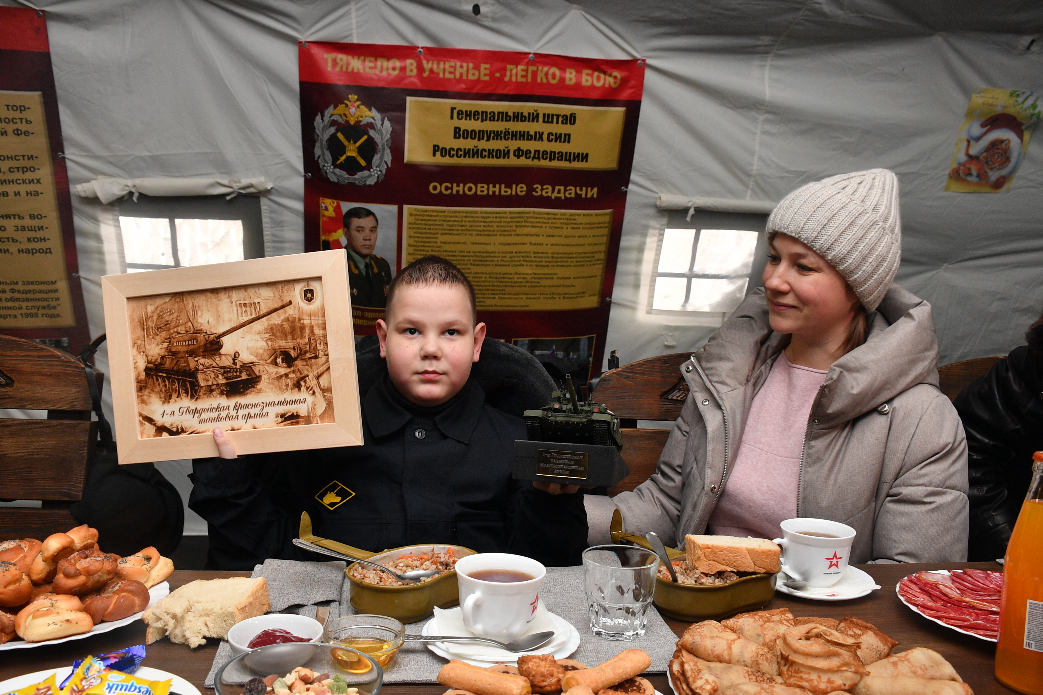 Экскурсия по полигону Алабино завершилась чаепитием с командованием танковой армии, где ребятам вручили сладкие подарки от Деда Мороза, макеты танка стоящего на вооружении армии и танковые шлемофоны.