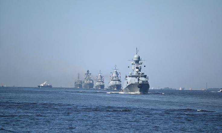 В морской части парада по Неве парадным строем прошли противодиверсионные катера «Нахимовец», П-468 и П-474, десантные катера «Алексей Баринов» с ботиком Петра I и «Иван Пасько», патрульные катера типа «Раптор», «Евгений Колесников» и П-436, противодиверсионный катер «Юнармеец Дагестана», базовый тральщик «Павел Хенов», малые ракетные корабли «Углич» и «Советск». К прохождению в Финском заливе парадным строем были привлечены 11 кораблей ВМФ и погрануправления ФСБ, а также дизель-электрическая подводная лодка «Уфа».